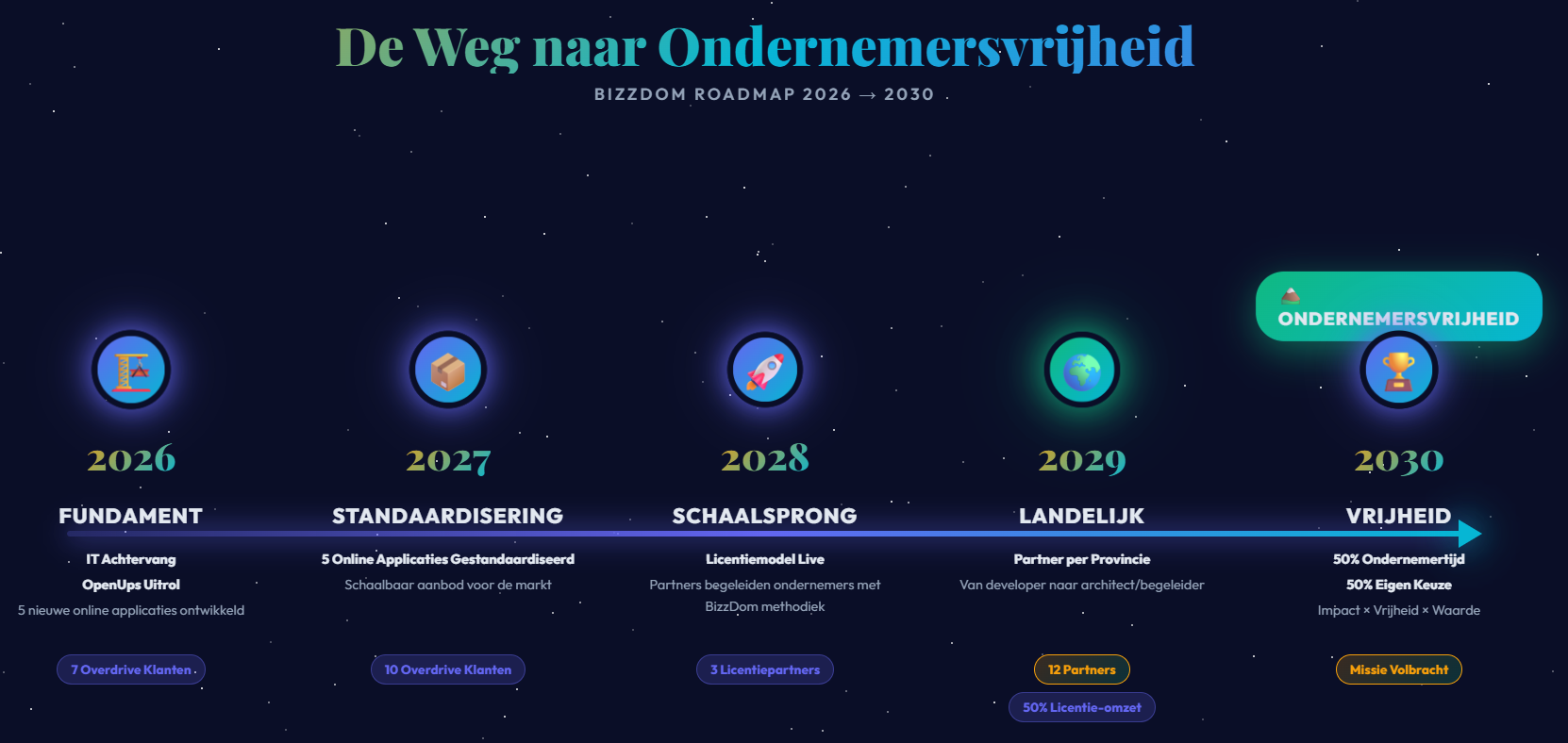 Voor mij geldt beide. Ik heb niet echt ‘stilgelegen’ tijdens de feestdagen. Tussendoor nog wat dingen gedaan. Maar ook goed kunnen nadenken om nog eens aan te scherpen waar ik mee bezig ben. En toen realiseerde ik me dat ik onbewust mijn Roadmap die ik jaren geleden al ontwikkelde nog steeds doorloop. Want mijn ambitie bevatte onder andere dat ik met 50% van mijn tijd mijn gewenste omzet en marge wilde kunnen realiseren, zodat ik de andere 50% van de tijd kon invullen zoals ik wilde - zakelijk of privé. Dat is altijd mijn ambitie van Ondernemersvrijheid geweest. Ik startte er al eens een licentiemodel op voor mijn Business Roadmaps programma, om deze ambities te realiseren. Maar dat werkte niet. Omdat ik niet de coaches vond die er net zoals ik in stonden. Maar waarschijnlijk ook ‘gewoon’ omdat mijn aanbod onvoldoende doorontwikkeld was. En daar heb ik grote sprongen in gemaakt. Met name door slimme inzet van IT, heel gericht en efficiënt met maatwerk voor mijn klanten. Zo begint een ecosysteem te ontstaan waarin ik erg veel vertrouwen heb dat een hernieuwd licentiemodel wel gaat aanslaan en ik zo binnen 5 jaar mijn ambitie bereik. Dus ‘poetste’ ik mijn roadmap nog eens op, actualiseerde hem en maakte er een grafische versie van. Om met jullie te delen.