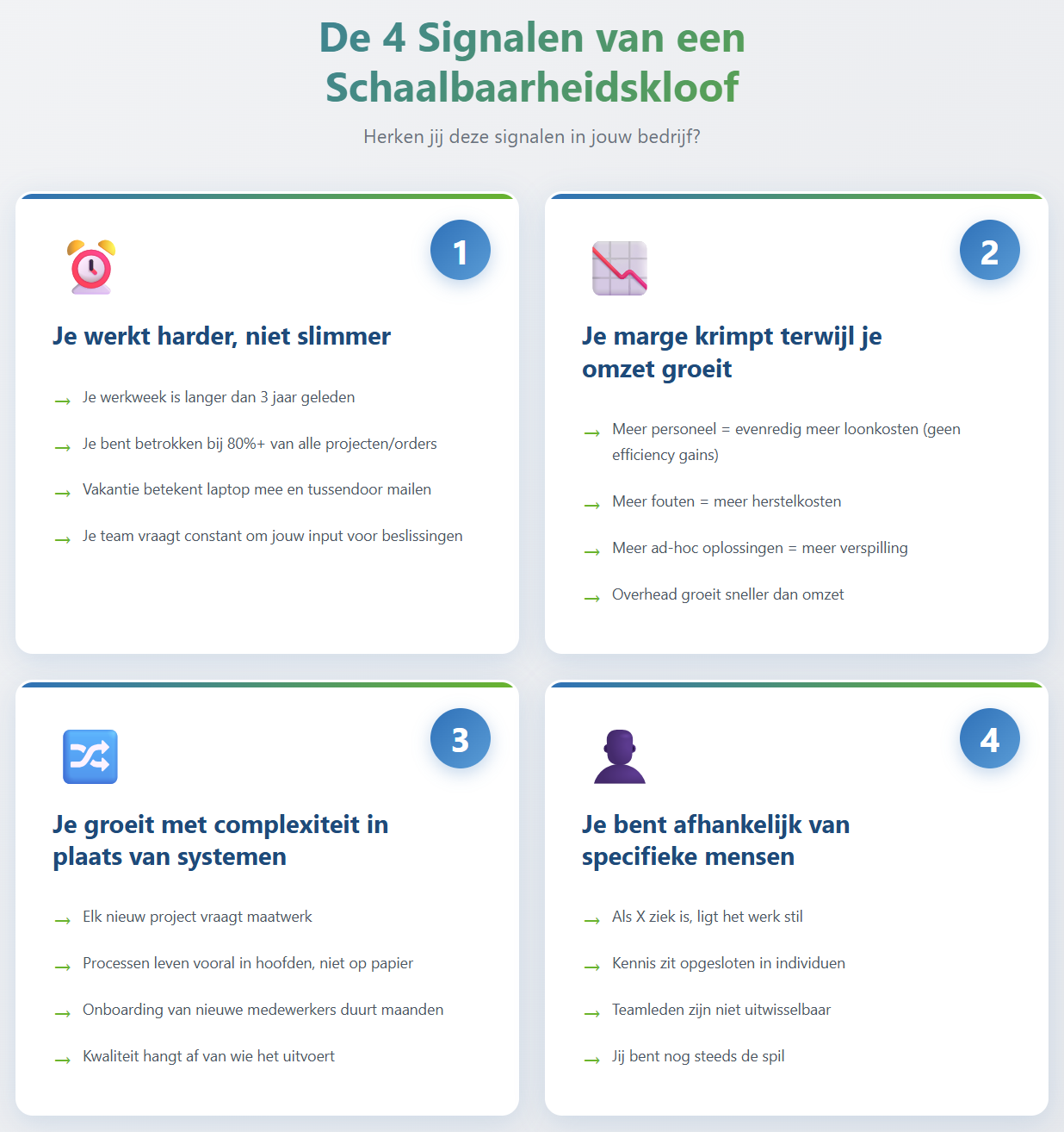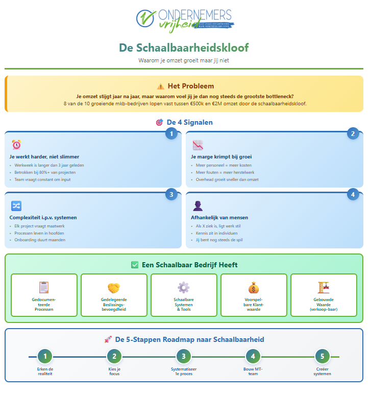 Doorloop de Schaalbaarheidskloof Scanner hier…De ongemakkelijke waarheid over groeiJe omzet stijgt jaar na jaar. Je hebt meer klanten dan ooit. Je t...